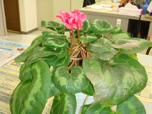 普通は冬に咲くものですが、このシクラメンは経理担当の堀内さんが毎日、こまめに面倒を見ていて、大事に大事に育てられています